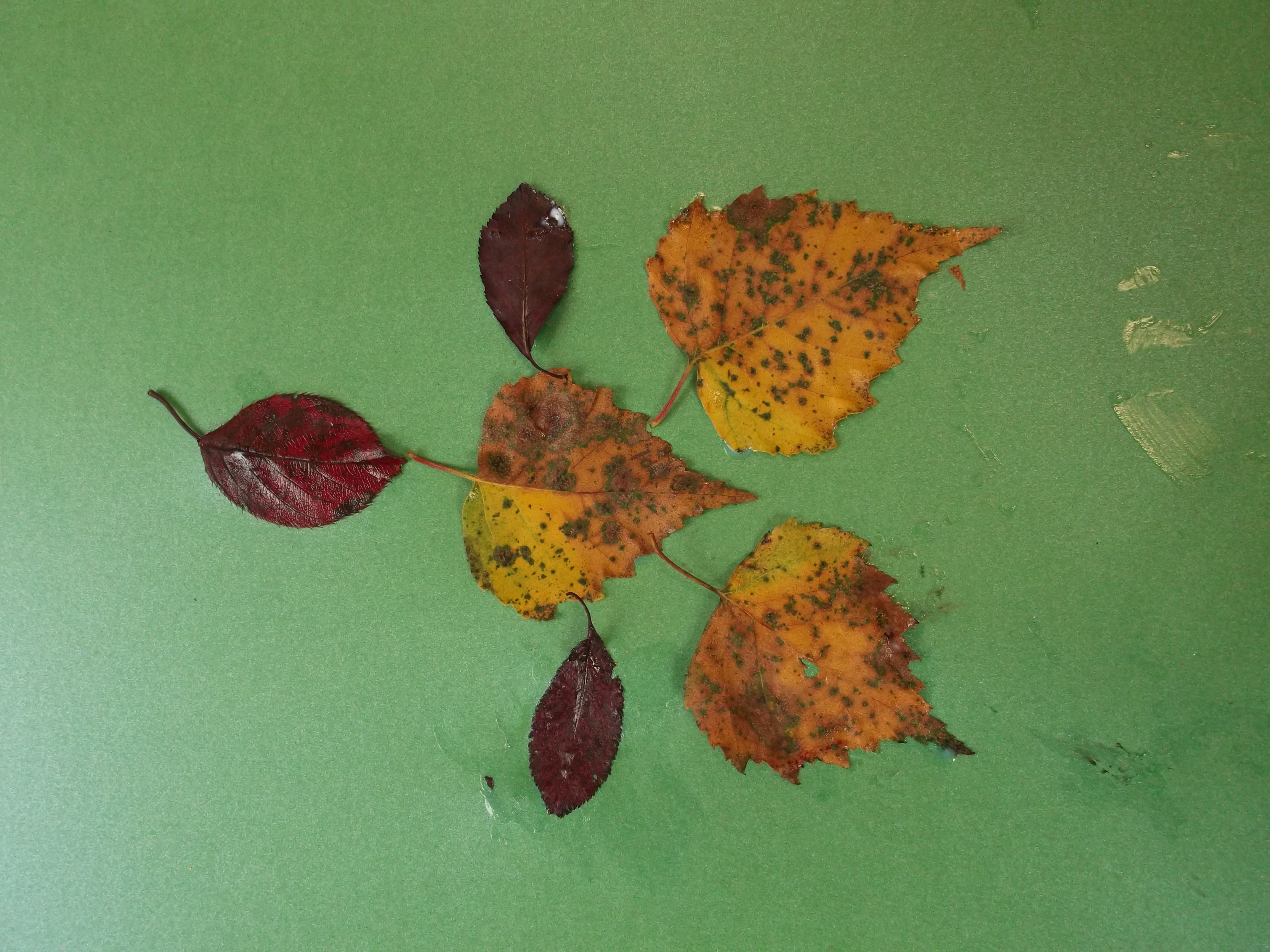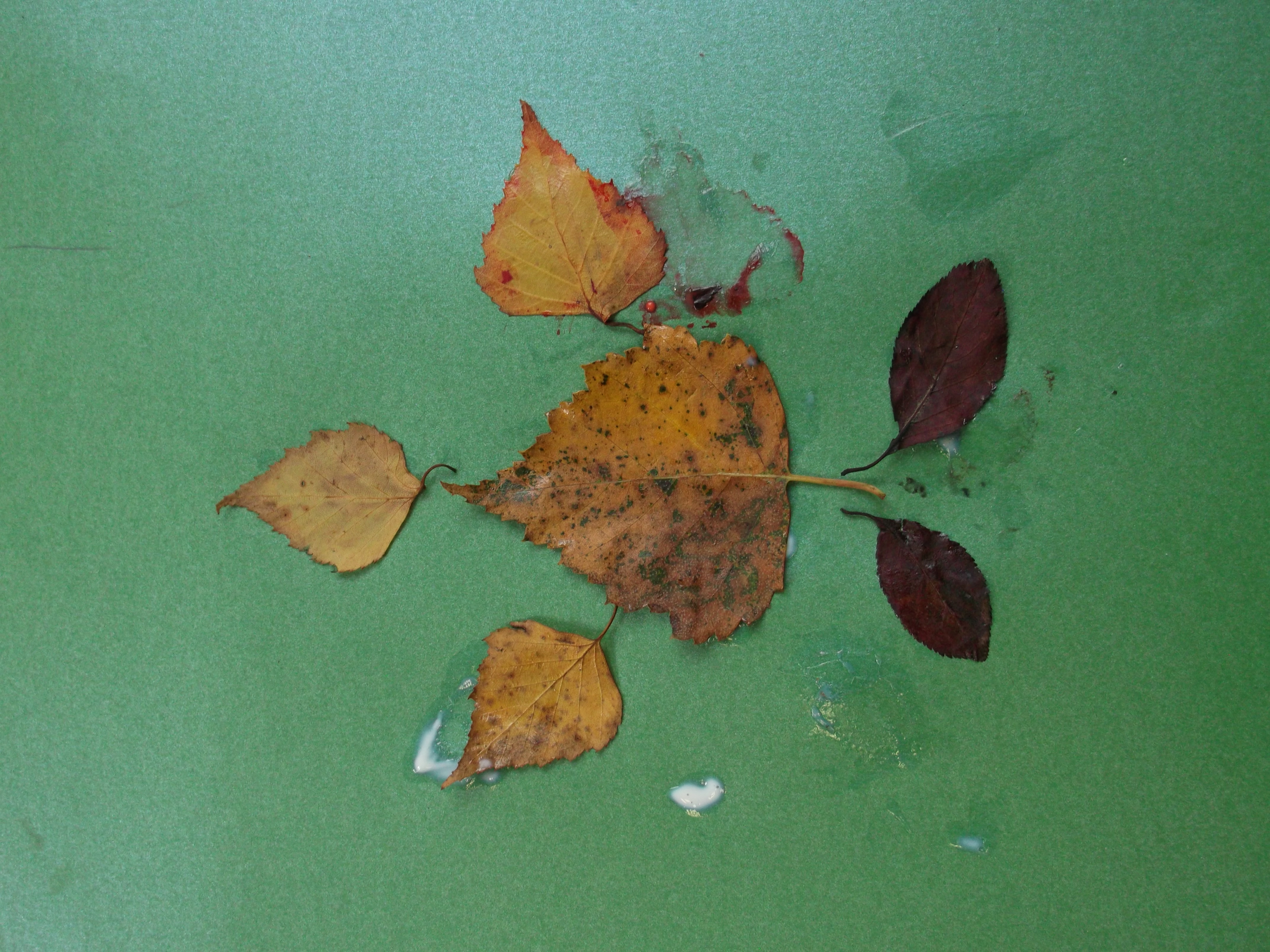 Après la cueillette de différentes feuilles d’automne de toutes les formes et de toutes les tailles, les GS les ont fixées sur une feuille canson. Ils ont pris de l’encre rouge, verte et orange et en ont passé autour des feuilles. Puis ils les ont retirées délicatement. Les empreintes apparaissent !